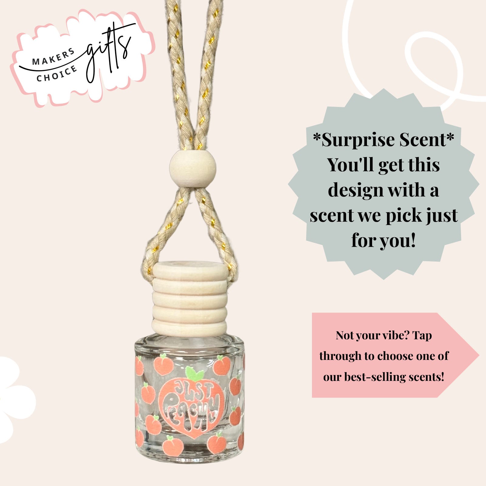 Our hanging scented car fresheners are the perfect blend of style and scent! Designed to dangle from your rearview mirror, each car diffuser features a unique design printed right on the bottle— Our Decorated Car Fresheners are truly the best on the market! No bland labels, just amazing scents and cuteness that lasts!